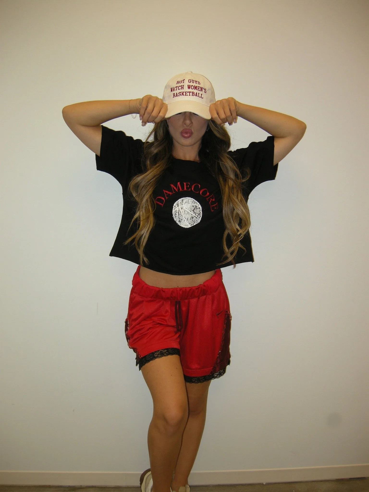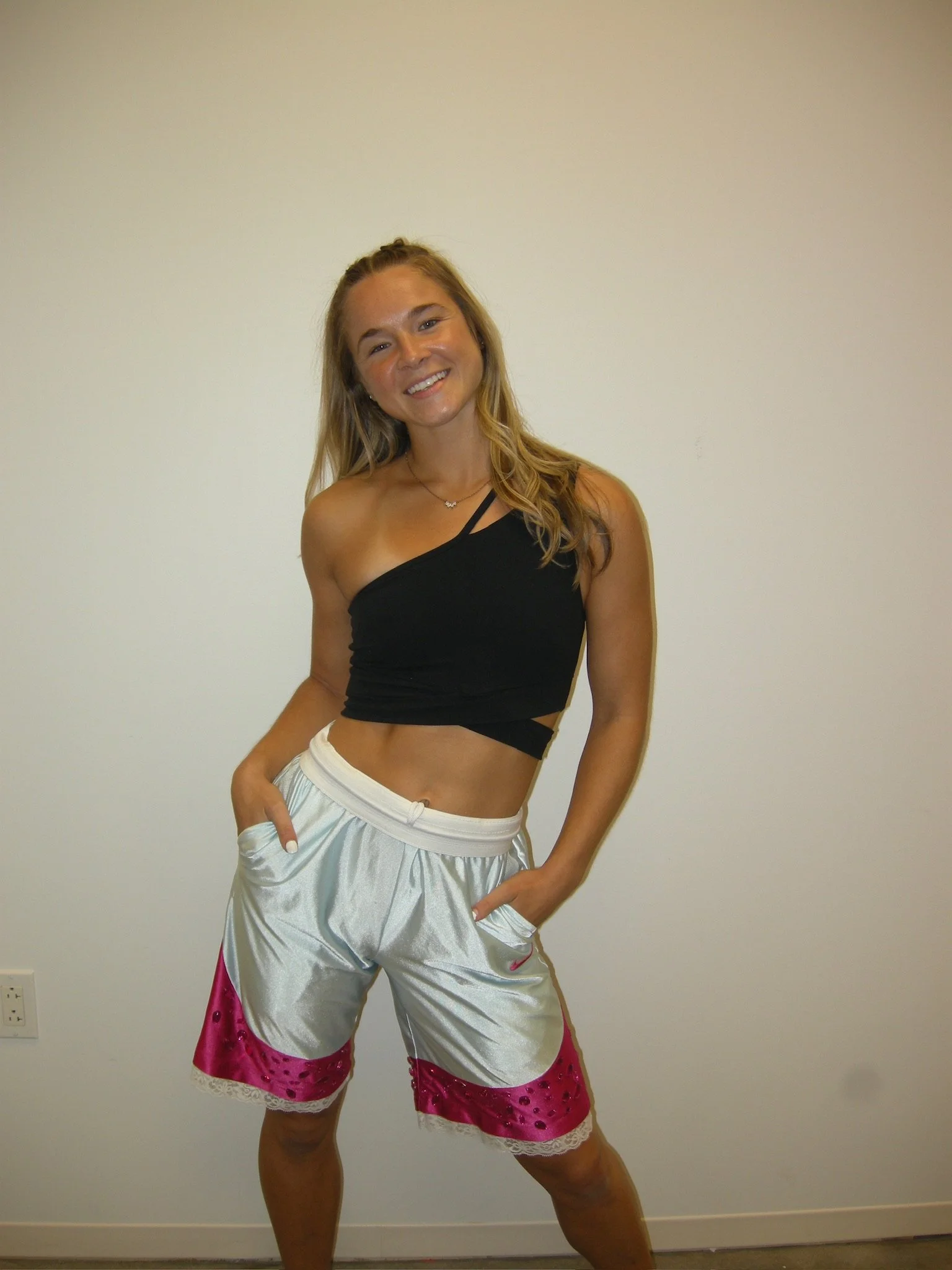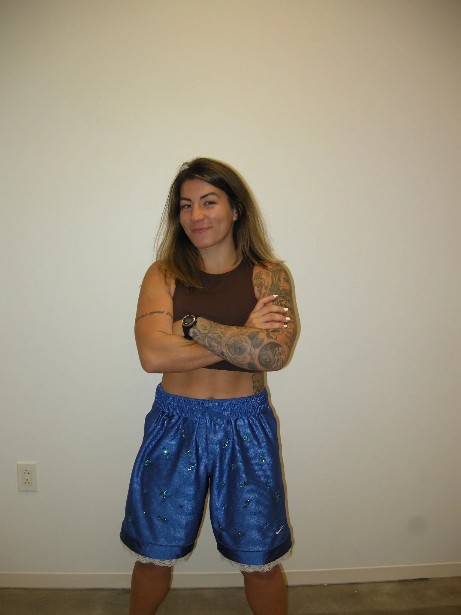 I reworked vintage basketball shorts into bold, feminine statement pieces. Guided by my values in sustainability, I transformed these garments through the addition of lace trims and gem embellishments. This approach not only gave new life to existing materials but also challenged traditional notions of femininity in sportswear.